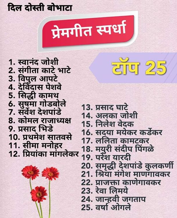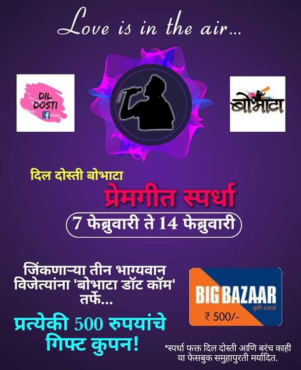 "बोलून दाखवण्यापेक्षा प्रेम हे संगीतातून अधिक उत्कटपणे व्यक्त होतं असं मला वाटतं, आणि त्यासाठी कुणाला व्यावसायिक गायक, कवी किंवा संगीतकार असण्याची गरज नाही... प्रेम व्यक्त करण्यासाठी आपल्याला जितकं संगीत येतं तितकं पुरेसं असतं. बोभाटा. कॉम व दिल दोस्ती आणि बरंच काही यांनी संयुक्तपणे आयोजित केलेल्या "प्रेमगीत" गायन स्पर्धेला रसिकांनी उत्स्फूर्त प्रतिसाद दिल्याचं समजलं. आतापर्यंत १०० हुन अधिक व्हिडिओ आले आहेत, आणि हा आकडा अजून वाढत जाईल असं वाटतंय. फेब्रुवारी हा प्रेमाचा महिना आणि उद्या वॅलेंटाईन्स डे असल्याने प्रेमगीत गायनाची स्पर्धा घेण्याचं प्रयोजन अगदी उत्तम आहे. ह्यासाठी बोभाटा. कॉम व दिल दोस्ती आणि बरंच काही ह्या ग्रुपचं आणि उत्साहाने भाग घेणाऱ्या रसिकांचं मनःपूर्वक अभिनंदन."
