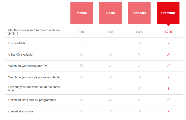 नेटफ्लिक्सने दरमहा १९९रुपये वाला एक नवीन प्लॅन लॉन्च केला आहे. कंपनीने या प्लॅनचे नाव ग- मोबाईल ठेवले आहे. या प्लॅनमध्ये ग्राहकांना फक्त SD क्वालिटीचे व्हिडीओ पाहायला मिळणार आहेत. आणि या प्लॅनचा वापर फक्त एका स्क्रीन करता येणार आहे राव!! या १९९रुपये वाल्या प्लॅनचा वापर करत असताना याला तुम्ही TV वर कास्ट नाही करू शकत.