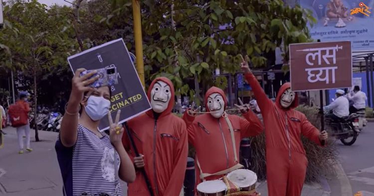 नेटफ्लिक्सच्या सर्वाधिक गाजलेल्या वेब सीरिजपैकी एक असणाऱ्या ‘मनी हाइस्ट’ला प्रेक्षकांनी भरभरुन प्रतिसाद दिला आहे. त्यातले ‘बेला चाओ’ गाणं पहिल्या सिझनमध्ये पहिल्यांदा तुम्हाला ऐकायला येतं. या गाण्यात प्रोफेसर कोणत्याही गोष्टीला कसा सामना करायचा हे शिकवतात. हीच प्रसिद्ध थीम घेऊन मराठीत गाणं करायचे ठरले. या गाण्याच्या चालीवर तयार केलेलं गाणं आपल्याला करोनाची लस घेण किती महत्त्वाचं आहे हे शिकवतं. “तिसऱ्या लाटेची घोषणा झाली, लस घ्या.. लस घ्या…” असं या गाण्याची सुरुवात होते. या व्हिडीओमधल्या कलाकरांनी ‘मनी हाइस्ट’ सिरीजमधील लूकही धारण केला आहे. त्यांनी लाल रंगाचे जम्पसूट आणि मनी हाइस्टमधला प्रसिद्ध मास्क घातला आहे. हातामध्ये धरलेल्या बोर्डवर मिम्स, घोषणा लिहिल्या आहेत. फक्त २.३० मिनिटांचे हे गाणे आहे. या गाण्याचे शूटिंगही वेगवेगळ्या ठिकाणी केले आहे.