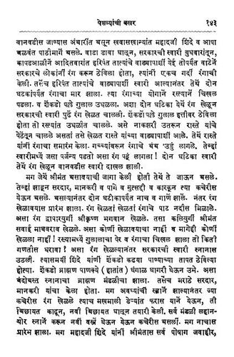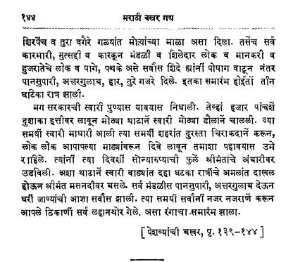 "मग श्रीमंत त्यांच्या जागी बसावयास गेले.दोन घटीका नाच आणि गाणे झाले. मग रंग खेळावयास प्रारंभ झाला.रंग खेळता खेळता रंगाचे पाट नदीस मिळाले.असा रंग द्वापार युगी श्रीकृष्ण भगवान खेळले....असा रंग खेळल्यावर सरकारची स्वारी स्नानास उठली. त्यासमयी शिंदे यांनी शेकडो कढया पाण्याच्या तापलेल्या ठेवल्या होत्या.शेकडो ब्राह्मण पाणके घंगाळ घागरी घेऊन उभे होते. मग अवघ्यांची स्नाने झाल्यावर ज्या कचेरीत रंग खेळले, त्याच मखमली डेर्यास फरास याने ती बिछायत काढून आणि नवी बिछायत घालून तयार केली.मग महादजी शिंदे यांनी श्रीमंतांस सर्व पोषाख, जवाहीर, शिरपेच, आणि तुरा वगैरे , गळ्यात मोत्याच्या माळा असा मान दिला.नंतर पानसुपारी अत्तर, गुलाब, हार, तुरे,गजरे दिले. इतका समारंभ होईपर्यंत तीन घटिका रात्र झाली. मग सरकारची स्वारी पुण्यास जावयास निघाली."