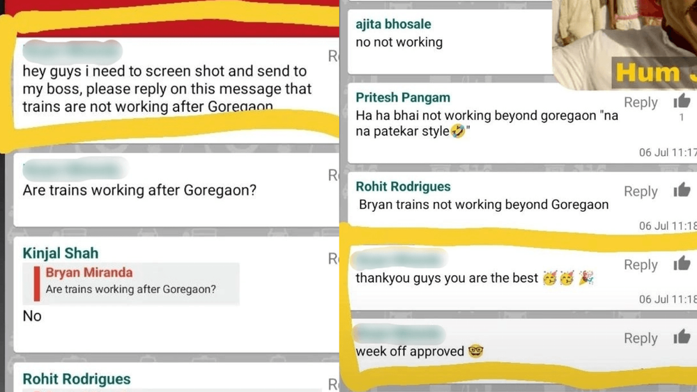"माझ्या बॉसला लोकल बंद असल्याचे पटवून द्यायचे असून आपण लोकल खरंच बंद असल्याचे सांगावे जेणेकरून बॉसला हा स्क्रीनशॉट शेअर करता येईल." यावर या ॲपवर असलेल्या अनेक लोक ज्यांना हा मॅसेजकर्त्याबद्दल काही माहिती नव्हती, त्यांनी एकापाठोपाठ एक सांगितले की लोकल खरेच बंद आहे.