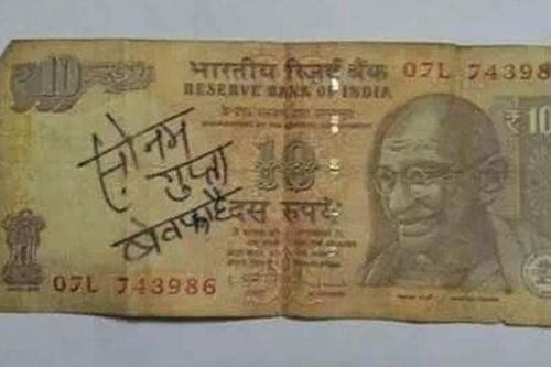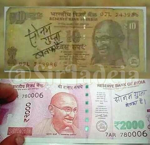 सद्या तुम्हाला प्रत्येकजण नव्या २०००च्या नोटेसोबतची आपली सेल्फी शेअर करताना दिसतोय. पण अशातच एका दहाच्या नोटेचा फोटोही वायरल झाला ज्यावर कोणीतरी पेनने लिहिलंय, "सोनम गुप्ता बेवफा है." आता ही बेवफा सोनम गुप्ता कोण आहे हेही कोणाला माहित नाही आणि तिच्या बेवफाईचा अशा पद्धतीने बदला घेणारा तिचा दिलजला आशिक कोण आहे हेही कोणाला माहीत नाही.