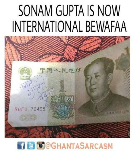 पण सोनमची ही बेवफाई आता १०,१००,२०००च्या नोटांसोबत विदेशी नोटांवर सुद्धा दिसायला लागलीय. त्यामुळे सोनम आता इंटरनॅशनल बेवफा बनलीय. आणि गंमत म्हणजे या सोनमनेही १००च्या नोटेवर मान्य केलंय. "हॉं, हूँ मे बेवफा!!"