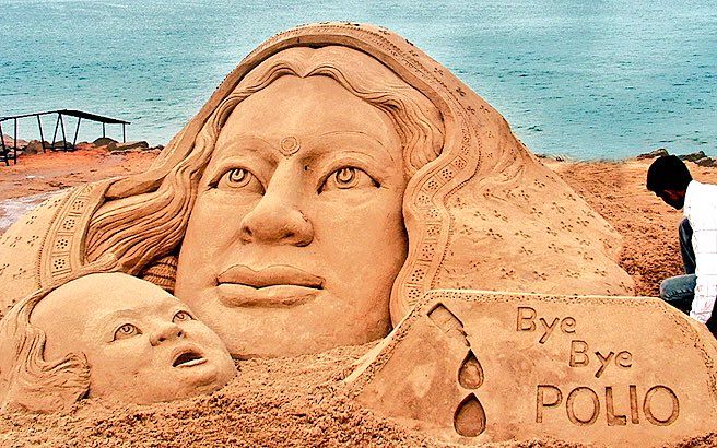 मंडळी या दिवसाकडे आपण पोलिओशी दिलेल्या यशस्वी लढ्याचं प्रतिक म्हणून बघू शकतो. म्हणूनच आजचा दिवस साजरा करण्यासाठी प्रसिद्ध ‘सँड आर्ट’ कलाकार ‘सुदर्शन पटनायक’ यांनी ओडिसाच्या किनाऱ्यावर एक अप्रतिम शिल्प साकारलं आहे. समुद्र किनाऱ्यावरची वाळू आणि आपलं कौशल्य याचा अप्रतिम नमुना म्हणजे हे सँड आर्ट’. या कलाकृतीवर ‘Bye Bye Polio’ लिहिलेलं आपण बघू शकतो.