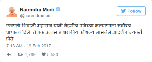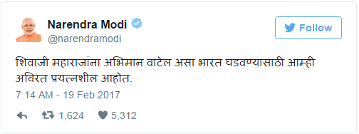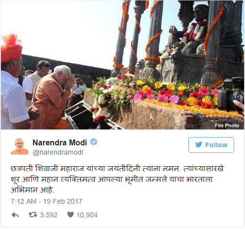 ‘छत्रपती शिवाजी महाराज यांच्या जयंतीदिनी त्यांना नमन. त्यांच्यासारखे शूर आणि महान व्यक्तिमत्त्व आपल्या भूमीत जन्मले याचा भारताला अभिमान आहे.’ असे पहिले ट्वीट करून नरेंद्र मोदी यांनी शिवाजी महाराजांचा गौरव केला.