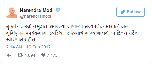 ‘नुकतेच अरबी समुद्रात उभारल्या जाणाऱ्या भव्य शिवस्मारकचे जल-भूमिपूजन कार्यक्रमाला उपस्थित राहण्याचे भाग्य लाभले. हा दिवस सदैव स्मरणात राहील.’ असे म्हणत मोदींनी शिवस्मारकाच्या भूमिपूजनाची आठवण करून दिली.
