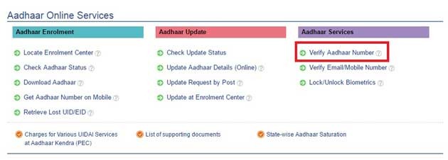 1. UIDAI च्या वेबसाईटच्या https://uidai.gov.in होम पेजवर तुम्हाला आधार सर्व्हिसेस नावाचा टॅब दिसेल. त्या खाली तुम्हाला Verify Aadhar Number ही लिंक दिसेल, त्यावर क्लिक करा.