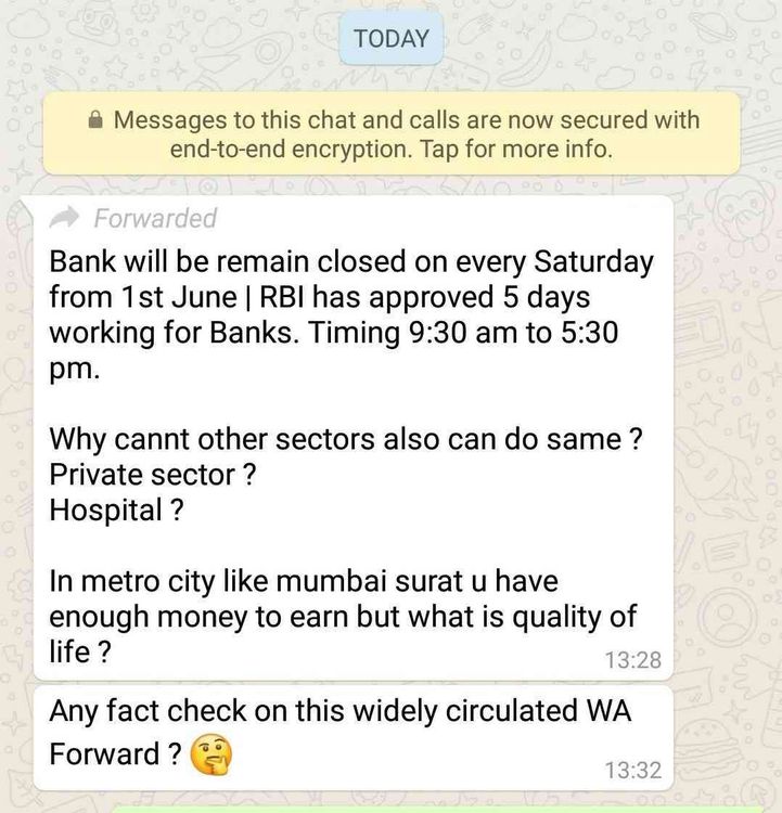 मंडळी, या मेसेजनुसार जर बँकांना ५ दिवस काम आणि २ दिवस सुट्टी मिळत असेल तर इतर क्षेत्रांना का नाही ? बँकेच्या उदाहरणावरून हा प्रश्न विचारण्यात आला आहे, पण खरं तर हा मेसेज खोटा आहे. सुरुवातच बघा ना, ‘१ जून’ असा उल्लेख आहे, पण वर्ष ? त्याचा तर पत्ताच नाही.