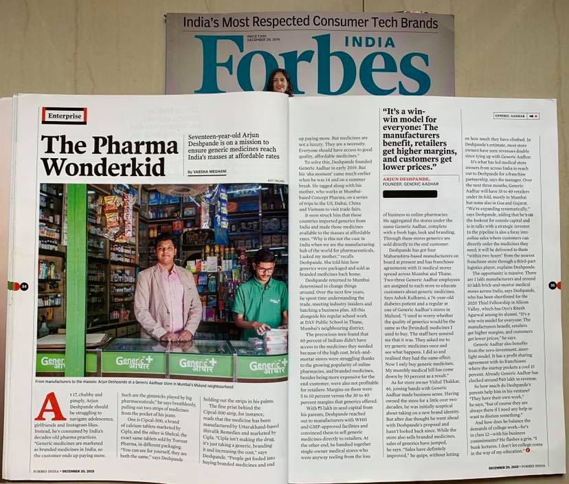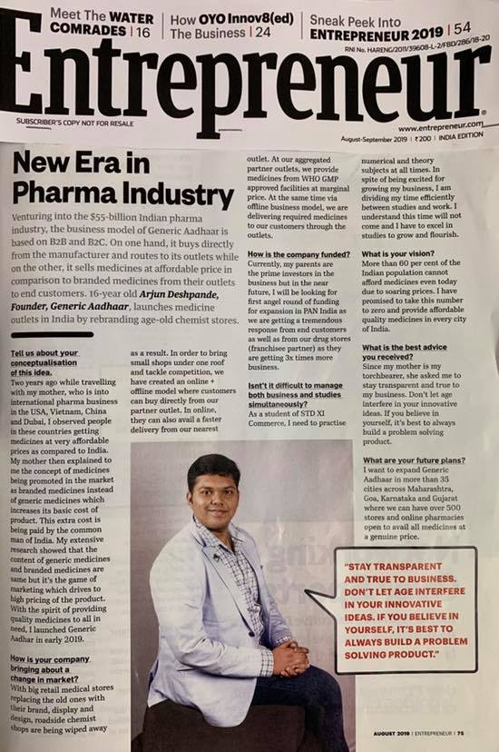 मुलाखतीपूर्वी थोडं अर्जुनबद्दल. अर्जुन देशपांडे. ठाण्यात राहणारा अठरा वर्षांचा, बारावीची परिक्षा दिलेला मुलगा. त्याने दोन वर्षांपूर्वी, म्हणजे सोळा वर्षांचा असताना जेनेरिक आधार नावाची सर्वांना परवडतील अशी औषधं पुरवणारी मेडिकल शॉप्सची मालिका सुरु करण्याचा उद्योग चालू केला आहे. नुकतीच म्हणजे मे २०२० मध्ये रतन टाटांनी या मुलाचं कौतुक करून त्याच्या कंपनीत गुंतवणूक जाहिर केली आहे. अर्जुनचं या यशाबद्दल मनापासून कौतुक आणि अभिनंदन करून आमच्या बोभाटा प्रतिनिधीचा त्याच्यासोबत झालेला संवाद आम्ही इथे प्रश्नोत्तर रुपात देत आहोत.