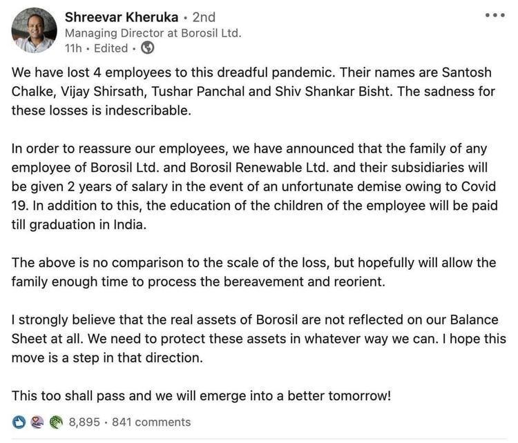 Borosil Ltd आणि Borosil Renewables Ltd या कंपन्यांमध्ये काम करणाऱ्या ४ कर्मचाऱ्यांचा कोविड-१९ मुळे मृत्यू झाला. तसं पाहता मृत्यूची बातमी काही नवीन नाही, पण या बातमीमध्ये एक वेगळेपण आहे.