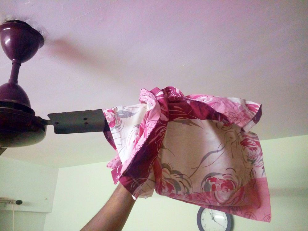 हे सगळं टाळायचं तर पंखे साफ न करून पण चालत नाही. मग आम्हांला मिळाला इंटरनेटवर कमीत कमी वेळात आणि धूळ न सांडता पंखे चकाचक करण्याचा एक उपाय. आज तोच आम्ही आमच्या वाचकांसाठी घेऊन आलो आहोत. करायचं काय, तर एक जुना उशीचा अभ्रा म्हणजेच पिलो कव्हर घ्यायचं आणि त्याची पंख्याच्या पात्याला मस्तपैकी टोपी घालायची. मग पंख्याच्या बुडापासून टोकापर्यंत उशीच्या कव्हरने हळूहळू पातं पुसायचं. यात होतं काय, पंख्यावर कितीही धूळ साचली असली, तरी ती सगळी त्या उशीच्या खोळीत जाऊन पडते. या पद्धतीत एक पातं साफ करायला अर्धं मिनिट पुरतं. कोरडी धूळ उशीच्या खोळीत जमा झाली आणि ओल्या कापडानं एकदा सगळी पाती पुसून घेतली की काम खल्लास!! मग ती खोळ उलटी करून कचर्याच्या डब्यात झटकून चांगली धुऊन घेतली तर पुढच्या वेळेसही पुन्हा कामाला येईल.