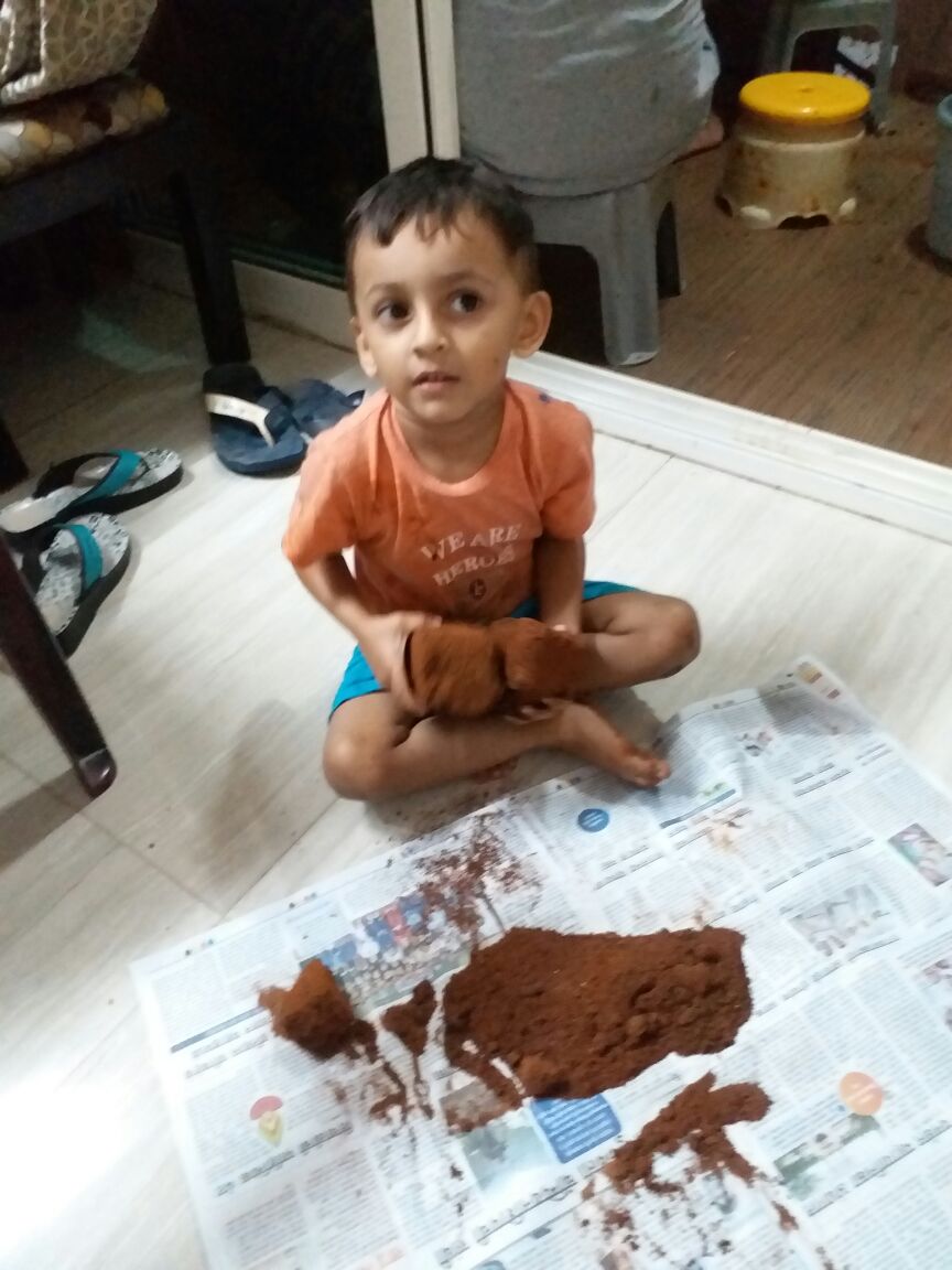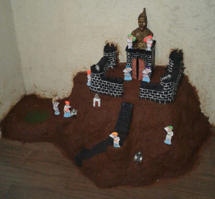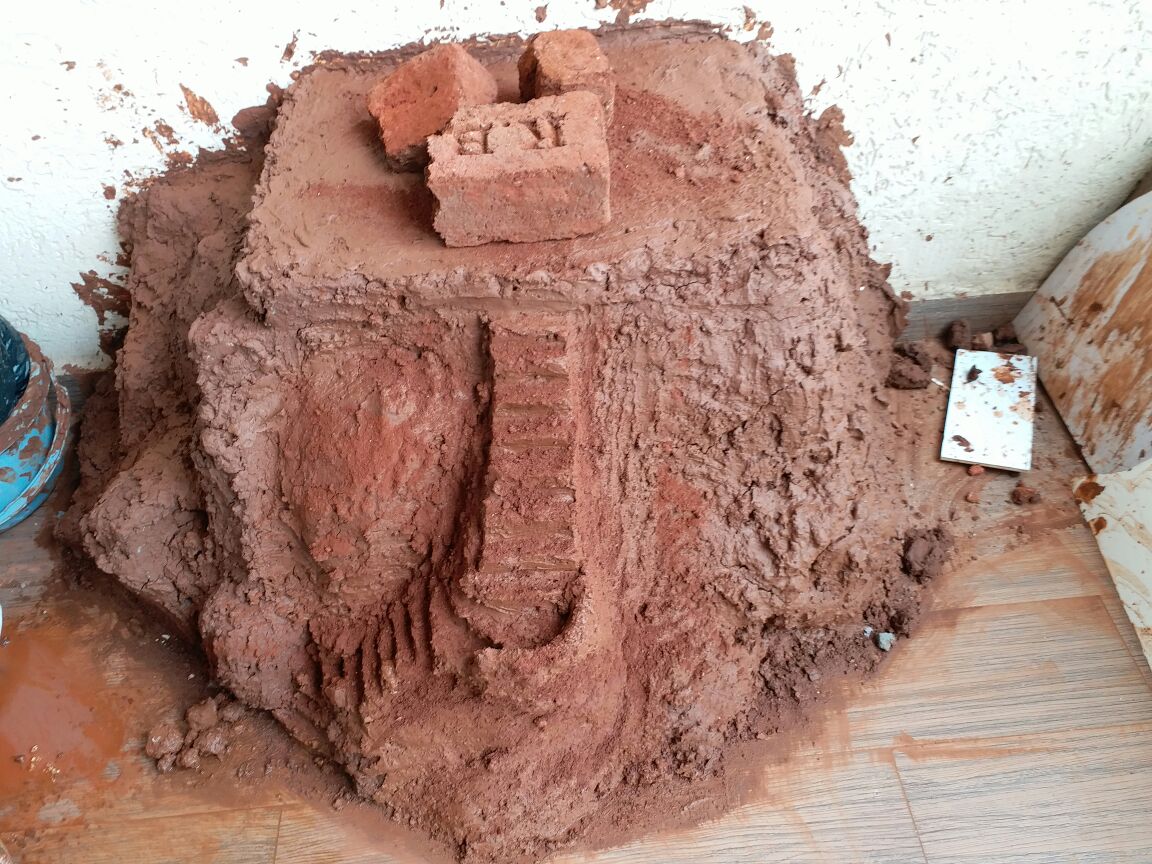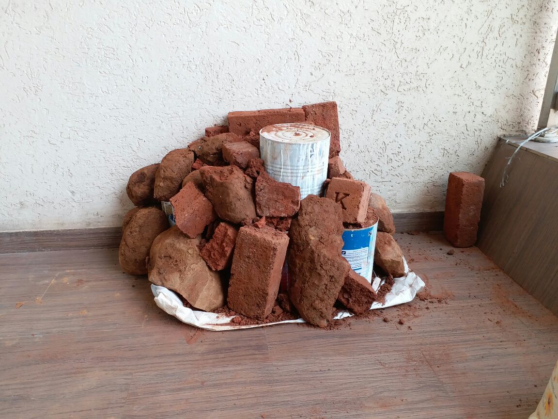 पेव्हर ब्लॉकच्या अंगणात माती मिळणार कशी ? थोडक्यात किल्ला बांधायचा तर रजा घेणे अपरिहार्य झालं. मग, नर्सरीतून माती, घरच्या कामातून उरलेले रंगांचे डबे, घोडबंदर रोडच्या खाडीवरून दगड आणि तिथल्याच ढिगाऱ्यातून सिमेंट ब्लॉक्सचे तुकडे मिळाले.
