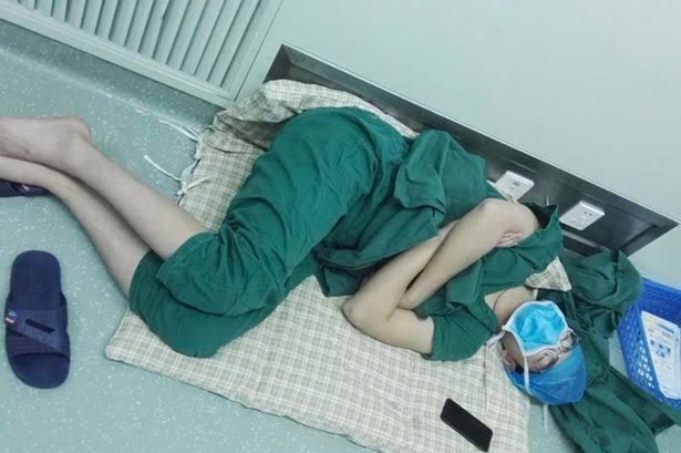 चिन मधल्या डिंगयुआन शहरातल्या एका हॉस्पिटलमध्ये टिपलेले हे चित्र आहे. लुओ हेंग नावाच्या या सर्जननं एका रात्रीत २ आणि त्याच्या पुढच्या दिवशी ३ अॉपरेशन्स करून सलग २८ तासांची शिफ्ट पूर्ण केली. त्यामुळे भयंकर थकलेल्या अवस्थेत, आहे त्याच स्थितीत त्यांनी हॉस्पिटलच्या जमिनीवर ताणून दिली. त्यांचे हे फोटो चायनीज सोशल नेटवर्किंग साईट वेइबोवर प्रसिद्ध झालेत. लोकांनी या सर्जनचं कौतुक केलंय, काहीजणांनी घरी बसूनच त्याला अॉनलाईन सॅल्युट ठोकलाय. तर बर्याच जणांनी "डॉक्टरांवर पडणारा अतिरिक्त कामाचा ताण" या विषयावर व्याख्यानं झाडली आहेत.