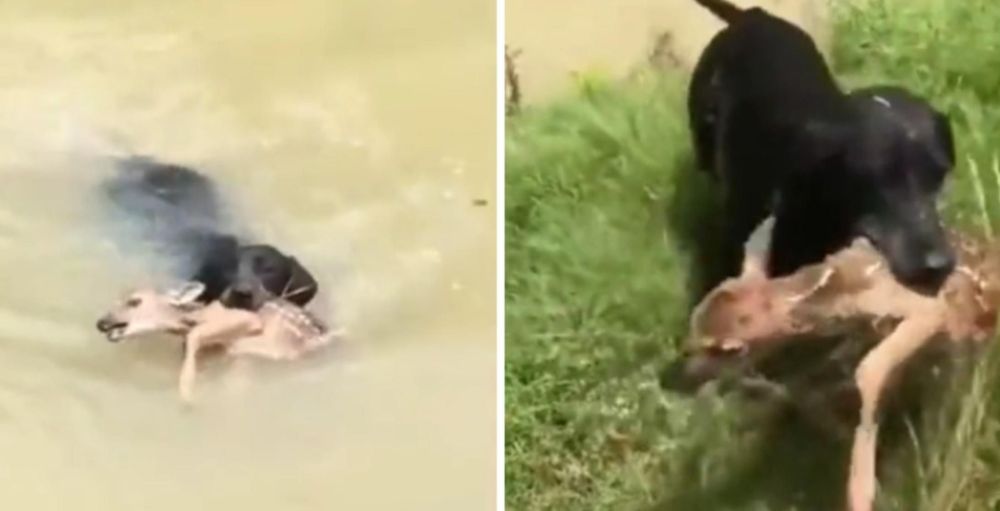 Dog saves baby deer from Drowning.