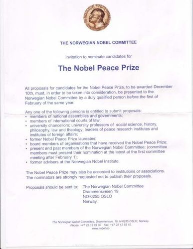 शांततेचा नोबेल पुरस्कार : नॉर्वेच्या संसदेने निवडून दिलेल्या ५ जणांच्या समितीकडून.