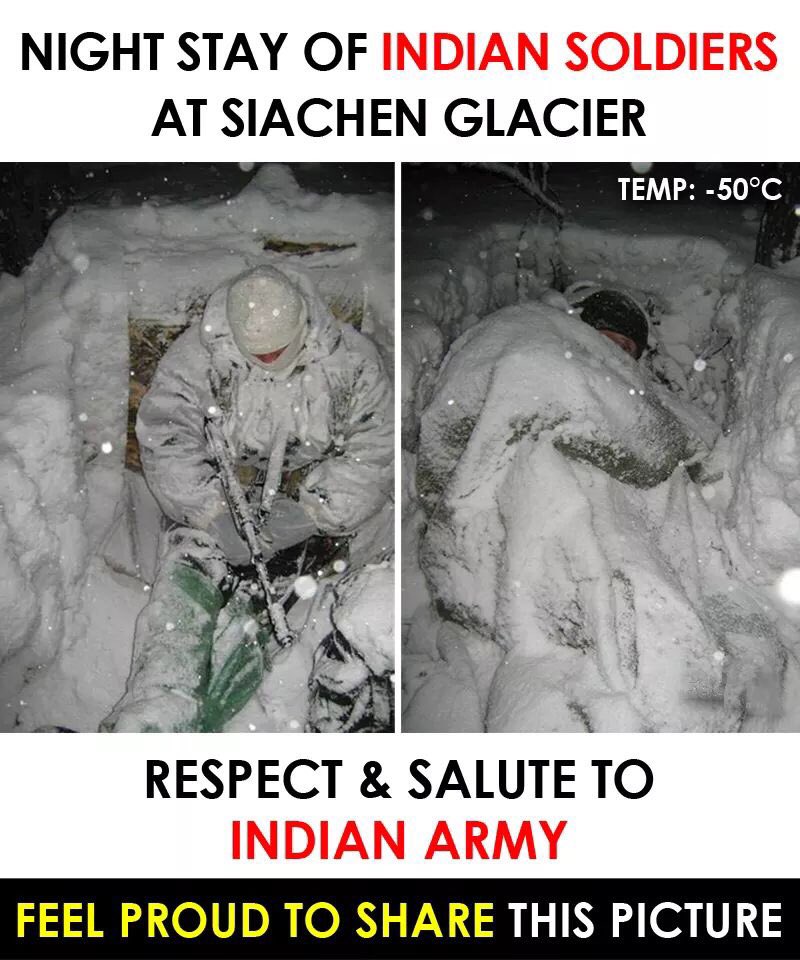 मंडळी, या पोस्टमध्ये २ भारतीय सैनिक सियाचीन सारख्या बर्फाळ प्रदेशात शून्यापेक्षाही कमी अशा -५० डिग्री सेल्सियस तापमानात झोपलेले दिसत आहेत. अशा भयंकर थंड तापमानात सामान्य माणूस राहूच शकणार नाही. पण हे भारतीय सैनिक आहेत राव. त्यांची जिद्द इथेच दिसून येते.