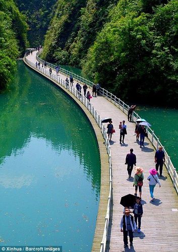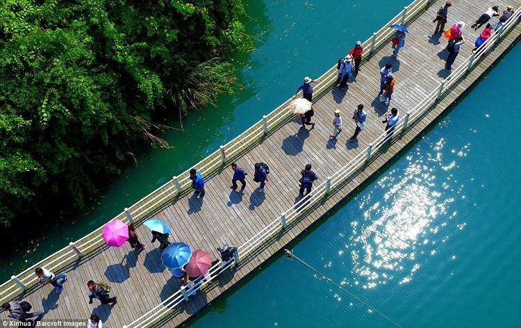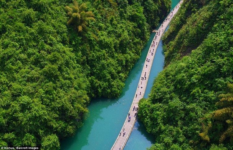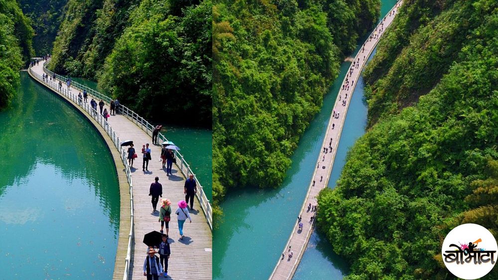 व्हिडीओत दाखवलेला पूल (किंवा walkway) हा चीनच्या हुबेई प्रांतातला आहे. २०१६ साली पूल बांधण्यात आला. या पुलाची लांबी केवळ ५०० मीटर आहे. पूर्वी नदी ओलांडण्यासाठी बोटीशिवाय पर्याय नव्हता. आज या पुलामुळे माणसांबरोबरच वाहनंसुद्धा नदी सहज ओलांडू शकत आहेत. नदीचा प्रवाह हा डोंगर कडांमधून मार्ग काढत गेलेला आहे. या नैसर्गिक आकाराने हिरव्यागर्द पहाडांचं अप्रतिम दृश्य पाहायला मिळतं. तरंगत्या पुलाचं कौतुक तर आहेच, पण निसर्गानेही या भागाला भरभरून सजवलंय. आपल्याकडे थ्री इडियट्स सिनेमा आल्यावर सगळेजण लेह-लडाखला जायला लागले होते. हा पूल पाह्यल्यावरही तिथं जायलाच हवं असं वाटतं.