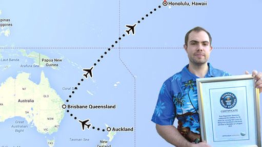 न्यूझिलँडमधल्या ऑकलंड मधून प्रवास चालू करून ऑस्ट्रेलियाच्या ब्रिस्बेनमार्गे त्यानं हवाई बेटात या प्रवासाची सांगता करत 46 तास वाढदिवस साजरा करण्याचा रेकॉर्ड बनवलाय. हे असले उद्योग करणारा हा एकटाच नाही हं. यापूर्वी पाकिस्तानच्या नर्गिस भीमजी या महिलेनं 35 तास वाढदिवस साजरा केला होता. तिनं १९९८ साली कराची ते सॅन फ्रान्सिस्को व्हाया सिंगापूर असा प्रवास करून वर्ल्ड रेकॉर्ड केलं होतं.
