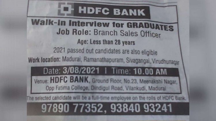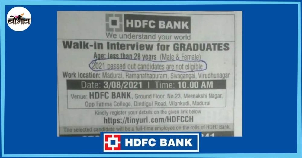एचडीएफसी ही देशातील आघाडीची बँक आहे. मदूराई येथील त्यांच्या शाखेत नविन पदभरती करायची होती. नेहमीप्रमाणे त्यांनी मुलाखतीसाठी उमेदवारांना बोलावणे धाडण्यासाठी वर्तमानपत्रात जाहिरात दिली. पण या जाहिरातीने देशभर खळबळ उडवली आहे.