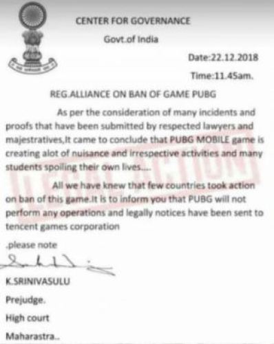 मंडळी, ज्या प्रकारे मिस्टर बिन मेला असं खोटं खोटं पसरवता येतं तसंच पब्जी बॅन होणार हेही पसरवता येतं. व्हायरल होणाऱ्या या नोटीस कडे नीट बघा. या नोटीस मध्ये शेवटी हायकोर्ट महाराष्ट्र लिहिलंय. महाराष्ट्रात महाराष्ट्र हायकोर्ट नसून मुंबई हायकोर्ट आहे. याशिवाय ज्या पदावरील माणसाने खाली सही केली आहे ते ‘Prejudge’ हे पद अस्तित्वातच नाही. याखेरीज नोटीस मध्ये इंग्रजी व्याकरणाच्या अनेक चुका आहेत ज्या सरकारी नोटीस मध्ये तरी पाहायला मिळत नाहीत.