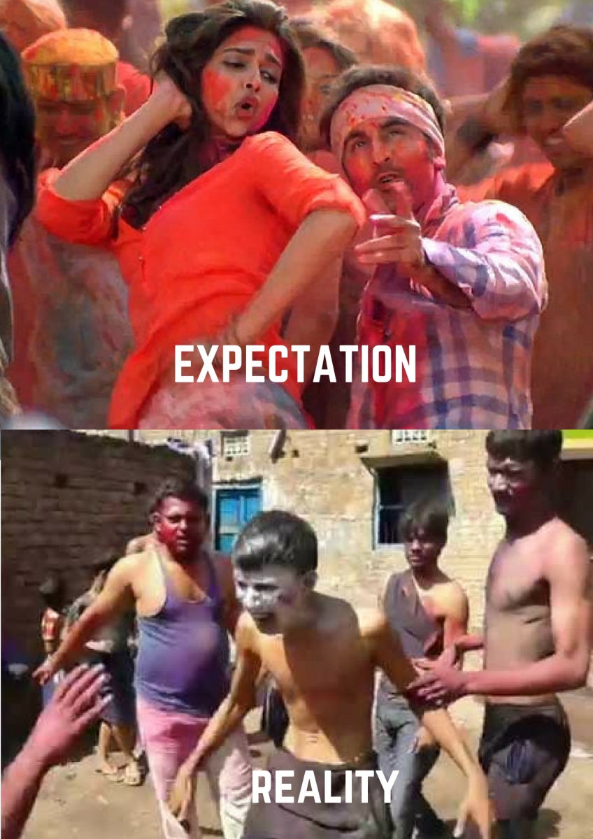 ती पिच्चरमंधी लय ग्वाड ग्वाड दाखवित्यात मायला. हिरो हिरोईन्या अंगाला कलर लावून बी काय झगामग दिसत्यात देवा रे देवा!! तो हिरो चिकन्या हिरोईनवर पानी काय टाकतो, तिला रंगवतो काय अन ती बी त्याला लाईन देते म्हणा. भांग पिवून बी सुरात गानं म्हणत्यात ते लोक. आता असलं बघितल्यावर आम्ही पण म्हटलं असाच ट्राय मारून बगू. लॉटरी लागली तर गावातली रेखा पटेल ना राव आपल्याला. एकदम हवा होईल गावात. पण कसलं काय ते पिच्चर मधलं येगळं आणि हे येगळं असतंय ना गड्या...