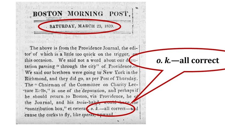 १८०० च्या दशकात अमेरिकेत ‘सगळं सुरळीत आहे’ किंवा ‘सर्व ठीक आहे’ या अर्थाने Oll Korrect हा शब्द मोठ्याप्रमाणात वापरला जात होता. मोठ्या शब्दांना संक्षिप्त करण्याच्या लाटेत लोकांनी Oll Korrect ला पण छोटं रूप दिलं. इतर संक्षिप्त शब्दांच्या मानाने मात्र O.K तेजीत पसरला. बॉस्टनच्या ‘बॉस्टन मॉर्निंग या प्रमुख वृत्तपत्राने’ आपल्या २३ मार्च १८३९ सालच्या पुरवणीत हा शब्द आपल्या एका लेखात वापरला होता. असं म्हणतात तिथून O.K चा अधिकृतपणे मुख्यप्रवाहात प्रवेश झाला. लवकरच बॉस्टन मॉर्निंगचं अनुकरण करत इतर वृत्तपत्रांनी हा शब्द वापरायला सुरुवात केली. तिथून पुढे Oll Korrect जाऊन O.K. हे संक्षिप्त रूप रुळलं.