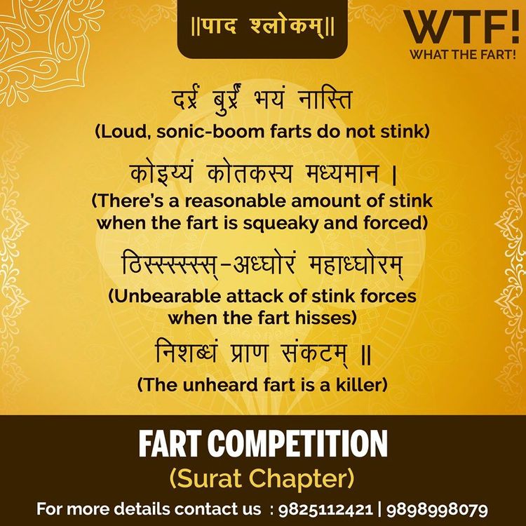 मंडळी, भारतात पहिल्यांदाच सुरत येथे “पाद स्पर्धा” आयोजित करण्यात आली आहे. या स्पर्धेचं नाव आहे What The Fart (WTF). जो स्पर्धक सर्वात मोठ्याने, सर्वात जास्त वेळ आणि सुरेल पादेल तो विजेता ठरणार आहे. जिंकणाऱ्याला ट्रॉफी सोबत ५००० ते १५००० पर्यंतचं बक्षीस मिळेल.