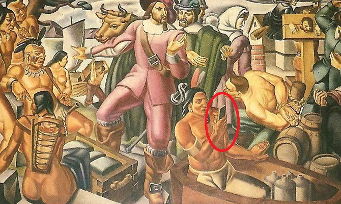 तर आता ८० वर्षं जुनं चित्र सोशल मिडियावर फिरतंय आणि ते चांगलंच चर्चेत आहे. या चित्रात आहेत नेटिव्ह अमेरिकन्स आणि प्रत्येक व्यक्ती वेगळ्याच पोजमध्ये दिसतेय. या चित्राचं नांव आहे, "Mr Pynchon and the Settling of Springfield". हे पेंटिंग १९३७ मधलं आणि ते चितारलंय आहे इटलीचे ख्यातनाम चित्रकार उम्बेर्तो रोमानो यांनी. या पेंटिंगमधल्या एका अमेरिकन आदिवासी मनुष्याच्या हाती असलेली गोष्ट सगळ्यांचं लक्ष्य वेधून घेतेय.