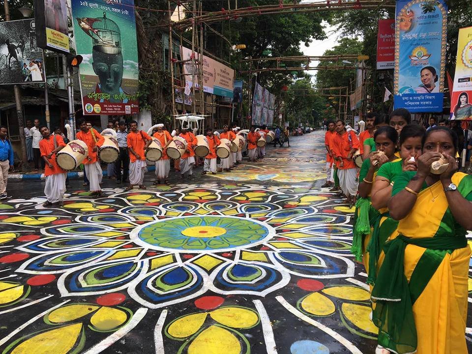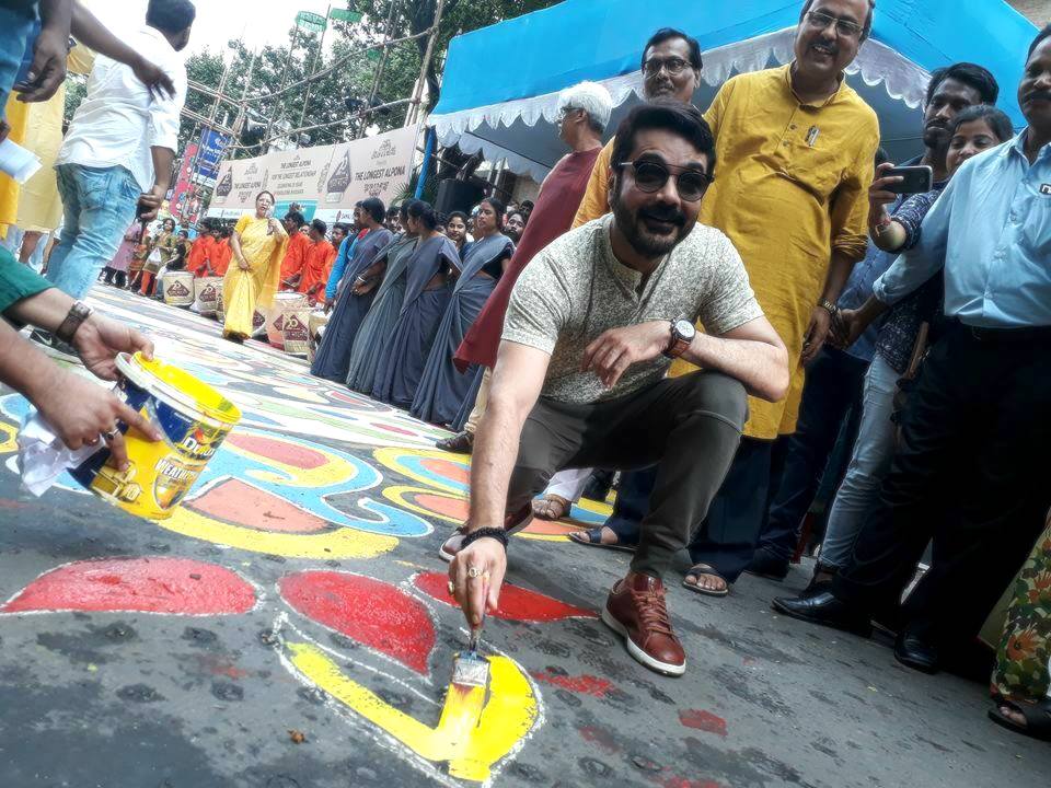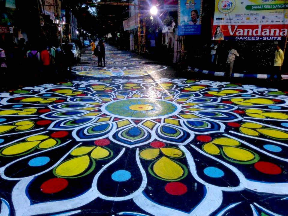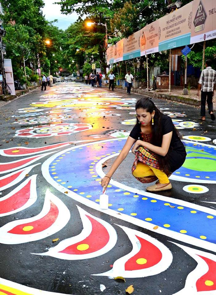 नवरात्री सुरू होतायत मंडळी आणि पश्चिम बंगालमध्ये तर हा सण खूपच भव्यदिव्य पध्दतीने साजरा केला जातो. कालच्या महालय अमावस्येला तिथे दुर्गादेवीचं स्वागत चक्क १.25 किलोमीटर्स लांब रांगोळी रस्त्यावर काढण्यात आली. या रांगोळीला अल्पोना किंवा अल्पना म्हटलं जातं. यासाठी जवळपास ३५० लोकांनी काम केलंय. आणि हे दृष्य भलतंच सुंदरही दिसतंय. सुपरस्टार प्रसेनजीत चटर्जी यांच्या हस्ते या रांगोळीचं उद्घाटन झालं आहे.