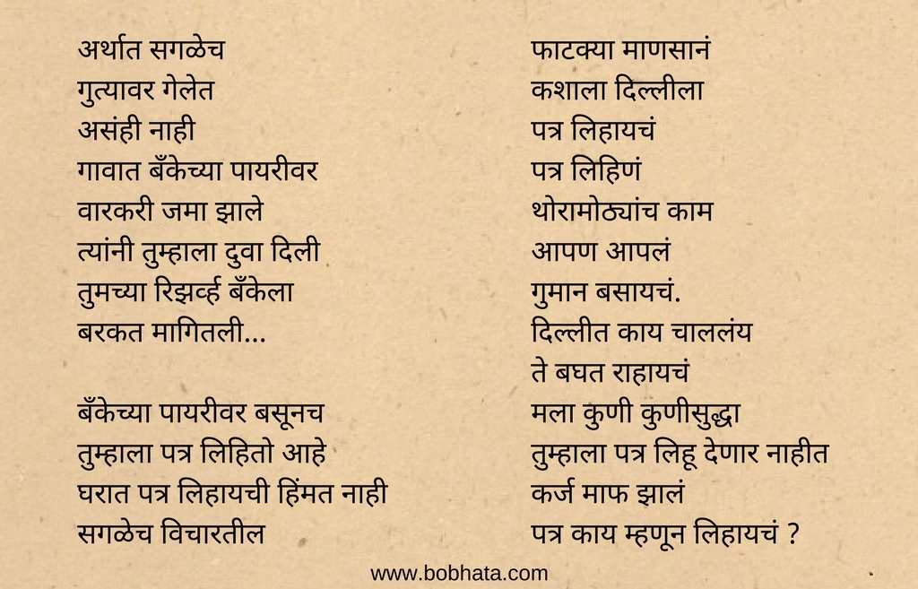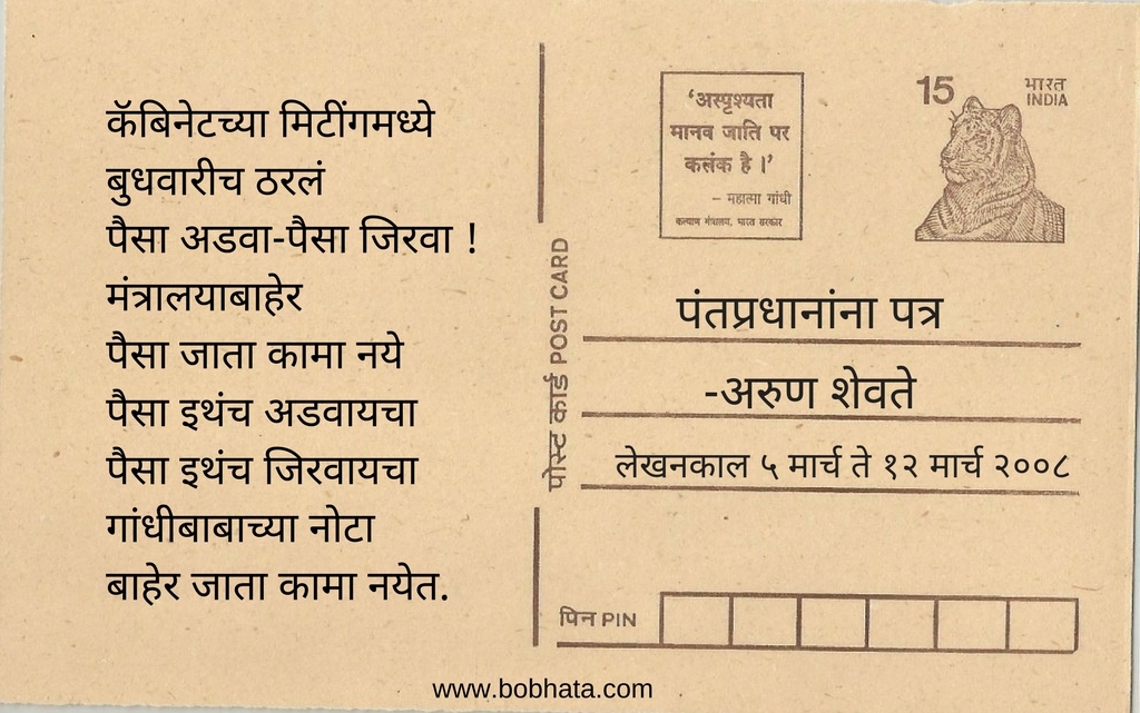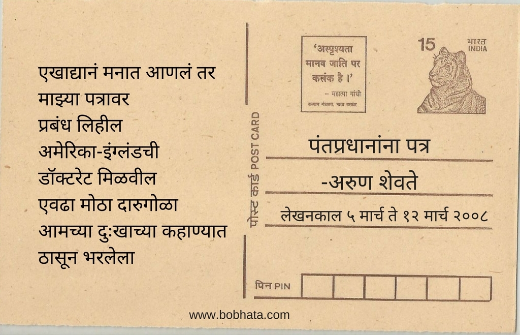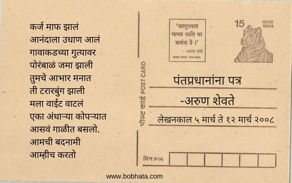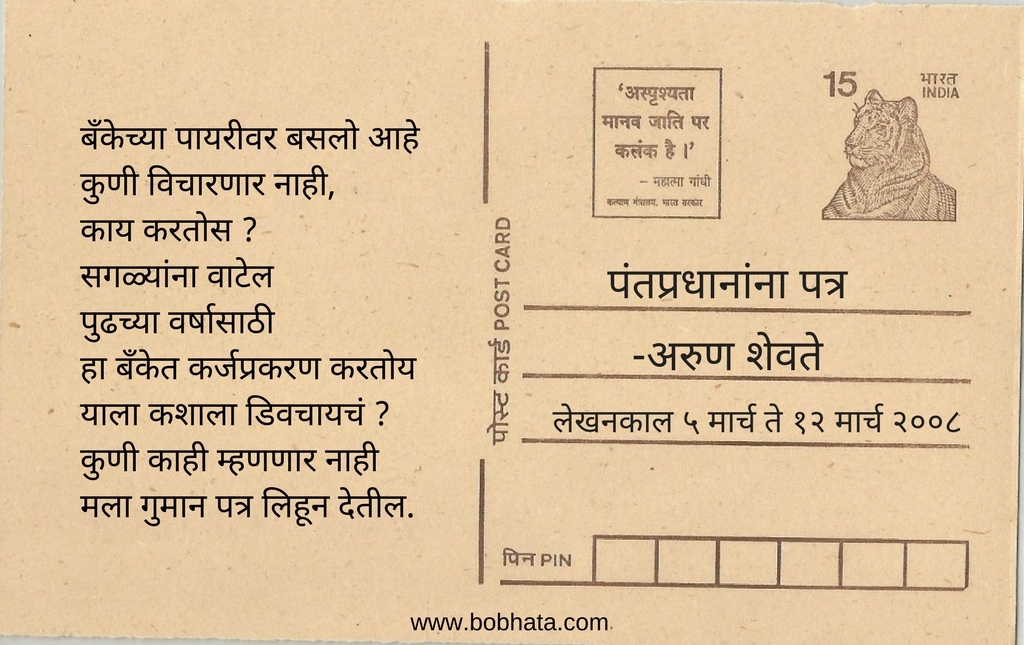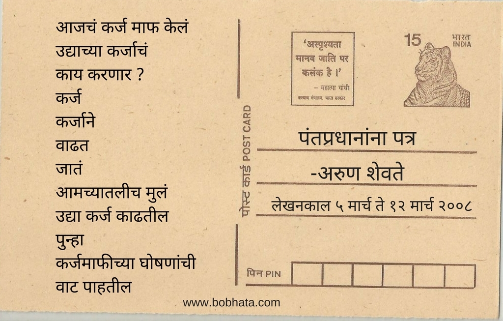 नुकतीच शेतकऱ्यांना कर्ज माफी झाली यानिमित्ताने आम्ही गेल्या ८-१० वर्षाचा शोध घेतला आणि आमच्या हाती लागला अरुण शेवते यांचा पंतप्रधानांना पत्र. हा तीन दीर्घ कवितांचा संग्रह ! २००८ साली हा संग्रह ग्रंथालीने प्रकाशित केला. या संग्रहातील काही निवडक वेचे (paragraph) आज आम्ही तुमच्यासाठी घेऊन आलो आहोत.