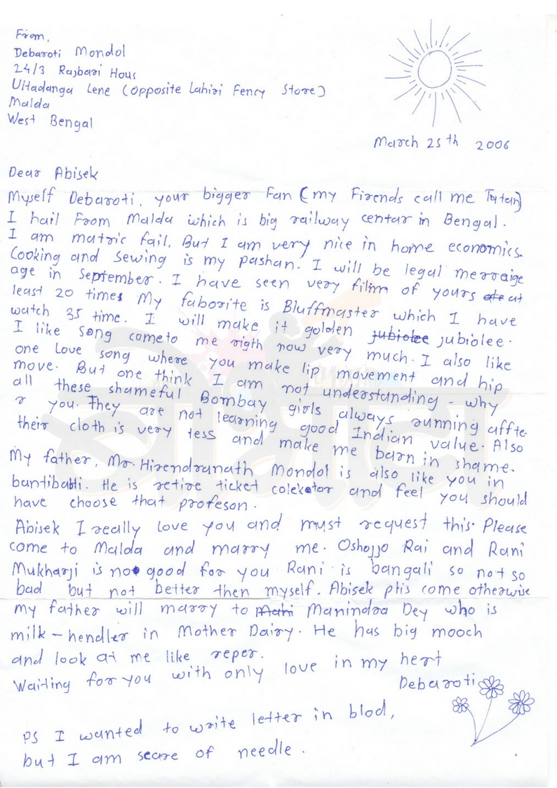 पोरी एकेकाळी राजेश खन्नाला स्वत:च्या रक्ताने पत्र लिहायच्या म्हणे! परिस्थिती आज ही फारशी बदललेली नाही. अभिषेक बच्चनच्या फॅनने लिहीलेलं एक पत्र आम्हाला मिळालं आहे! हे पत्र लिहिलंय देबोरती मोंडल नावाच्या एका मुलीने.