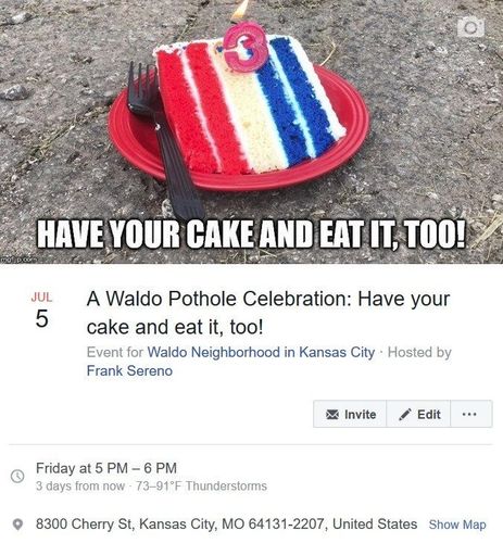 ....पण रस्त्यातले खड्डे फक्त भारतातच आहेत का ? अहो ते अमेरिकेत पण सापडतात. अमेरिकेतल्या कॅन्सस सिटी भागातल्या रस्त्यात पण असाच एक खड्डा होता. तो गेली ३ महिने झाले दुरुस्त केलेला नव्हता. फ्रँक सेरेनो या स्थानिक रहिवाश्याने त्याबद्दल वारंवार तक्रार केली होती. त्याची तक्रार कोणी ऐकून घेतली नाही. शेवटी वैतागून त्याने एका अनोख्या ढंगात निषेध नोंदवला आहे. त्याने चक्क रस्त्यातल्या खड्ड्याचा वाढदिवस साजरा केलाय.