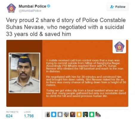 तर अंधेरीच्या साकीनाका भागात घडलेली ही घटना आहे. एक माणूस आत्महत्या करण्यासाठी डोंगरावर चढला. कुणीतरी १०० नंबरला फोन करून कळवलं. जवळच काम करणार्या कॉन्स्टेबल सुहास नेवासे यांनी वेळीच पावलं उचलली आणि अनवाणी डोंगर चढून गेले. वर जाऊन त्यांनी साधारण अर्धातास त्या माणसाला समजावलं आणि खाली घेऊन आले.