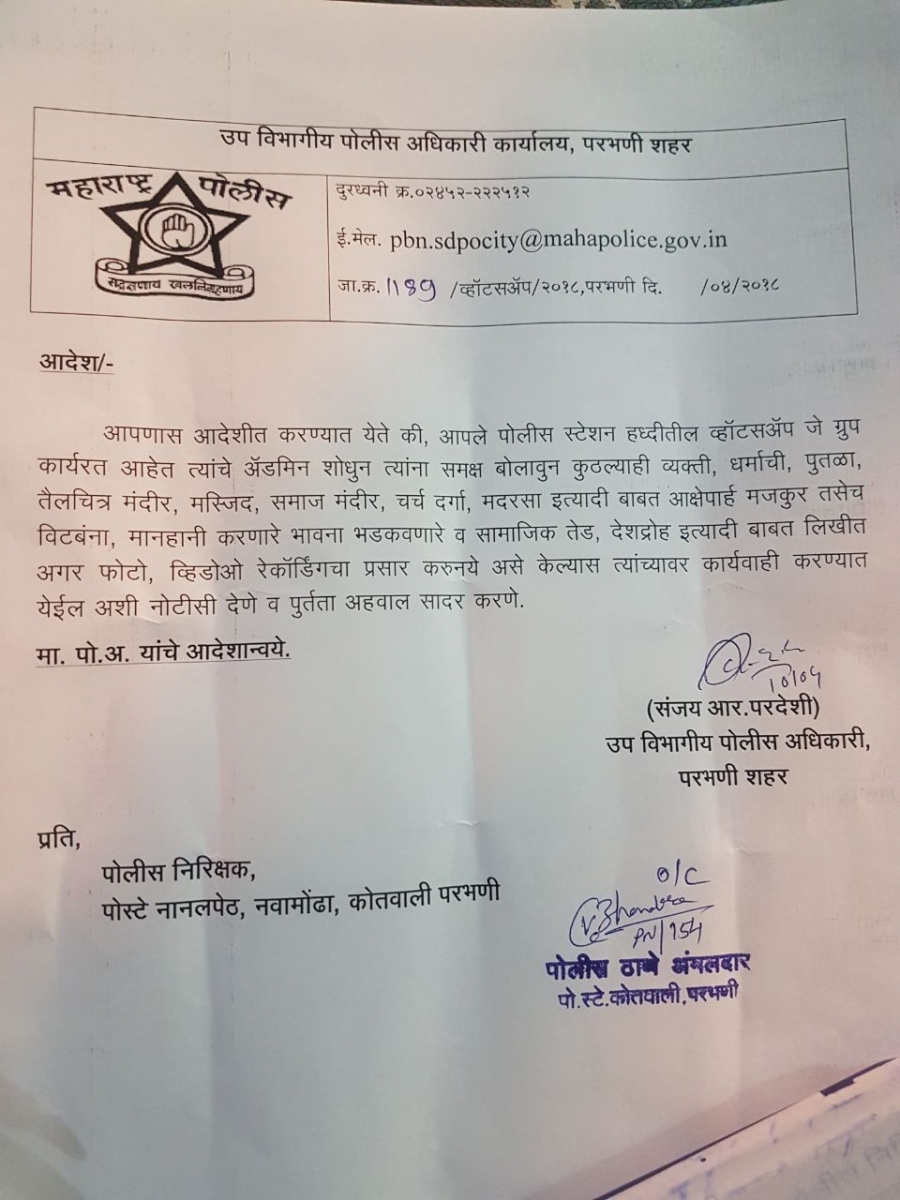 या पत्रात परभणी शहरातील उपविभागीय पोलीस अधिकाऱ्यांना प्रत्येक पोलीस स्टेशनच्या हद्दीतील व्हॉट्सअॅप ग्रुपच्या अॅडमीनना नोटीस देण्याचे आदेश देण्यात आले आहेत. अफवा कोणत्याही प्रकारची असो चुकीला माफी मिळणार नाही भौ.