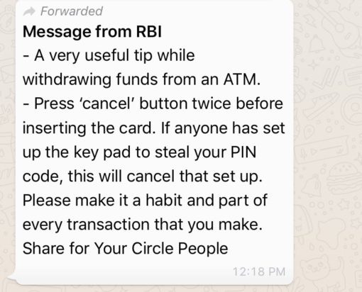 या मेसेज मध्ये सांगण्यात आलंय की ATM मशीनचा वापर करण्यापूर्वी दोनदा कॅन्सल बटन दाबा. असं केल्याने तुमचा पिन नंबर सुरक्षित राहतो. या मेसेजच्या खरेपणाबद्दल तपासणी केल्यावर हा मेसेज खोटा असल्याचं दिसून आलं आहे. रिझर्व बँकेने असा कोणताही फतवा काढलेला नाही. शिवाय मेसेज मधल्या इंग्रजीच्या चुका हे खोटं असल्याचं उघडपणे सांगत आहेत.