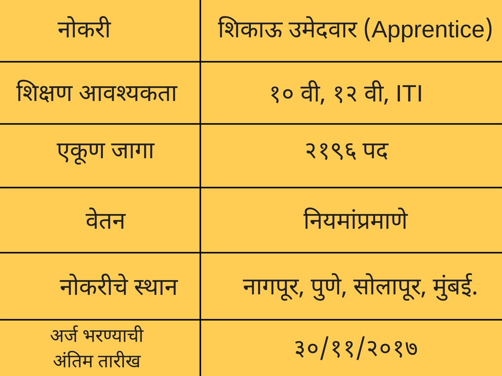 सेन्ट्रल रेल्वे तर्फे रोजगाराची मोठी संधी चालून आली आहे. मंडळी, रेल्वे विभागात नोकरीसाठी जेव्हा संधी येतात तेव्हा साधारणपणे ५० किंवा १५० जागांसाठी भरती असण्याची बातमी येते पण यावेळी तब्बल २१९६ जागांसाठी भरती सुरु आहे.