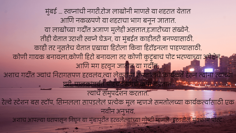 ठाण्यातील विजय जाधव यांच्या समतोल फाउंडेशनचे स्वयंसेवक मात्र या मुलांच्या शोधात असतात.त्यांना विश्वासात घेऊन पुन्हा एकदा घरापर्यंत पोहचवण्याचा प्रयत्न करतात.बर्याचवेळा हा प्रयत्न यशस्वी होतो- काहीवेळा असफलता पण पदरात पडते. तरीही अव्याहतपणे समतोल आपले कार्य सुरुच ठेवते.समतोलच्या विजय जाधवांची सविस्तर मुलाखत आपण नंतर घेणार आहोतच पण त्या आधी त्यांच्या अनुभव कथनाचे 'हरवलेलं मुक्काम पोस्ट'या पुस्तकाचा ब्लर्ब आपण वाचू या.