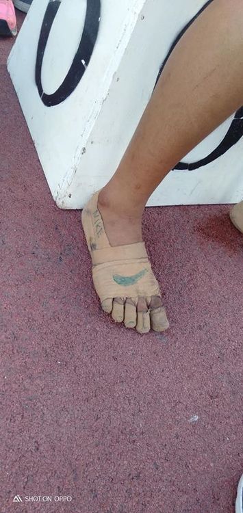 फिलिपाईन्सची ११ वर्षांची रिया बुल्लोस हिने शाळेच्या धावण्याच्या स्पर्धेत ४०० मीटर, ८०० मीटर आणि १५०० मीटरच्या शर्यतींमध्ये सुवर्णपदक मिळवलं आहे. तिन्ही प्रकारांमध्ये सुवर्ण मिळवल्यावर ती एका जागी शांत बसून खेळ पाहत होती. तितक्यात एका व्यक्तीने तिचे पाय बघितले. तिच्या पायात शूज नव्हते. शूजच्या जागी तिने बँडेज गुंडाळला होता. त्यावर तिने हातानेच नाइकी कंपनीचा लोगो काढला होता. हा पाहा तिचा पाय.