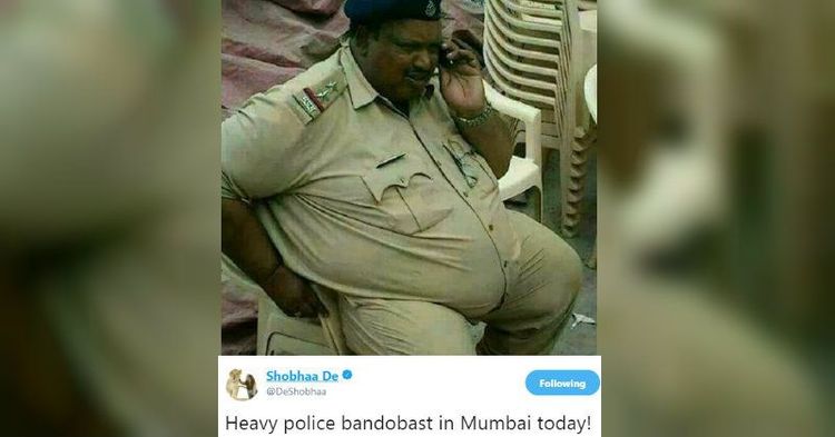 काय मंडळी, तुम्ही हे वाचताय म्हणजे तुम्हाला हा फोटो आठवतोय. काय, नाही आठवत म्हणताय? चला तर मग, आम्ही तुम्हाला एक पूर्वसूत्र म्हणजेच रिकॅप देतो. तर झालं असं होतं, मुंबईतल्या निवडणुकाच्या वेळी शोभा बाई डे यांनी एक ट्वीट केलं होतं आणि त्यात म्हटलं होतं, "मुंबईत भारी पोलीस बंदोबस्त"! सोबत हा फोटो जोडला होता. तुम्ही असलं ट्विट केलं तर मंडळी ट्विपल्स तुम्हाला सोडणार आहेत का?? तर या पोलिसाच्या आकारामानावर केलेला विनोद जनतेला नाही आवडला. आणि त्यांनी शोभा बाईंना लाथाड लाथाड लाथाडले.