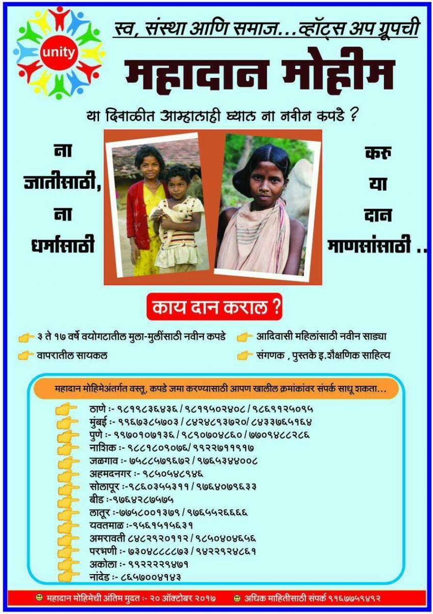 “वंचितांची दिवाळी करूया आनंदी...आपल्या मुलांसोबत एक जोडी कपड़े यांच्यासाठीही...आपल्या आई , बहिणीला, पत्नीला साडी घेताना एक साडी त्या आदिवासी माऊलींसाठीही घेऊया.....”