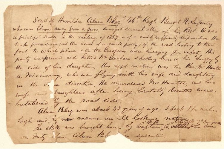 ती कवटी आलम बेग नावाच्या एका सैनिकाची होती. हवालदार आलम बेगने १८५७ साली भारतीयांनी कंपनी सरकार विरुद्ध पुकारलेल्या स्वातंत्र्य युद्धात भाग घेतला होता.