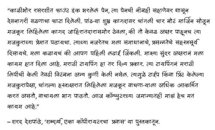 सध्या तुम्हाला ‘बोभाटा’वर दिसणारी वळणदार अक्षरं ही शरद देशपांडे यांच्या हस्ताक्षराचीच देणगी आहे, असं म्हणलं तरी वावगं ठरणार नाही. मोठमोठ्या ब्रँडच्या लोगोपासून सोशल मिडीयावर फिरणाऱ्या कविता, संतवचनांपर्यंत अनेक प्रकारची देवनागरी लिखाणं सध्या या फॉन्टमध्ये लिहिलेली दिसतात. या सुंदरशा फॉन्टच्या निर्मितीची कथाही तितकीच रंजक आहे. हा फॉन्ट ज्यांच्या हस्ताक्षरावरून डिझाईन करण्यात आला आहे, ते म्हणजे शरद देशपांडे. १९६२पासून मराठी भाषेतील ग्राहकप्रिय आणि वाचकांच्या संग्रही राहिलेल्या हजारो जाहिराती लिहिणारे मराठी कॉपीरायटर, शरद देशपांडे (‘घराला घरपण देणारी माणसं...’ हे शब्द त्यांचेच). भाषेवर, लिखाणावर भरभरून प्रेम करणाऱ्या शरद देशपांडे यांनी पुण्यातल्या ‘सेतू अडव्हर्टायझिंग’ या जाहिरात कंपनीची स्थापना केली. समस्त सेतू परिवाराचे लाडके ‘काका’ असलेल्या देशपांडे यांनी मराठी कॉपीरायटिंगची कला एका वेगळ्याच उंचीवर नेऊन ठेवली.