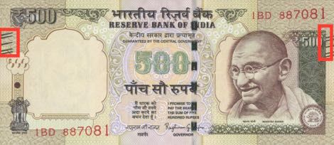 तर मंडळी या रेघा आहेत दृष्टीहीनांसाठी. त्या ब्रेल लिपीत आहेत. पाचशे च्या नोटेवर 2-1-2 अश्या तर 1000 च्या नोटेवर 1-2-2-1 च्या पॅटर्न मध्ये रेघा आहेत. नुसतं हाताळून सुद्धा आता नोटेची किंमत ओळखणे शक्य झाले आहे.