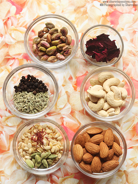 १. एका भांड्यात बदाम, काजू, पिस्ता, कलिंगडाच्या बिया, खसखस, हिरव्या वेलची, दालचिनी आणि मिरपूड घेऊन ते एकत्र करा.