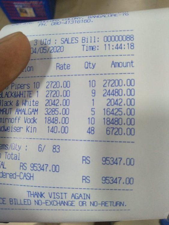 काल तिन्ही झोन मधली दारूची दुकाने काही नियम आणि अटी राखून उघडण्यात आली. एवढे दिवस दारूचा थेंब न मिळालेल्या मंडळींसाठी ही पर्वणीच होती. भल्या मोठ्या रांगा लावून लोकांनी खरेदी केली. एकट्या कर्नाटकात ४५ कोटींची मद्यविक्री झाली आहे भाऊ. ४५ कोटीत सर्वात मोठा हातभार असलेलं एक बिल सध्या व्हायरल होत आहे. या बिलमध्ये चक्क ५२,८४१ रुपये एवढ्या रकमेची दारू घेतल्याचा उल्लेख आहे.