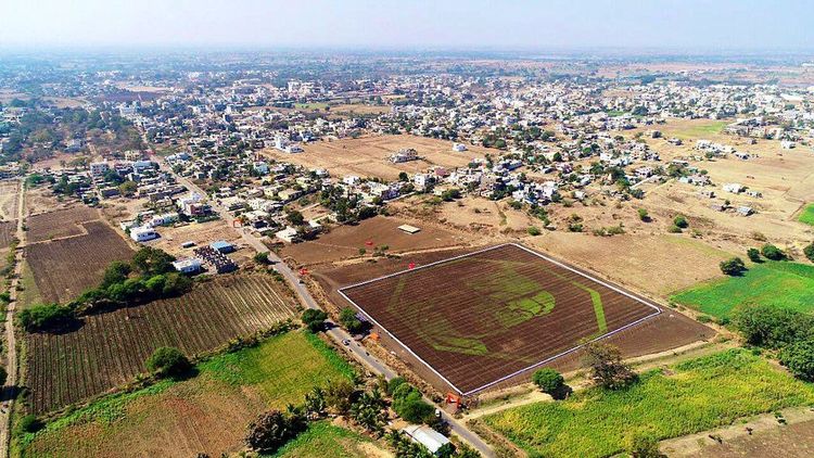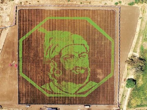 तब्बल 2.5 लाख स्केवर फूट शेतात तयार करण्यात आलेली ही प्रतिमा सर्वांचे लक्ष वेधून घेत आहे राव!! गवत उगवून तयार केलेली ही प्रतिमा मंगेश निपाणीकर यांनी तयार केली आहे.