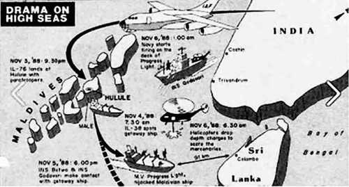 ही गोष्ट आहे सुमारे तीन दशकांपूर्वीची. नेमकं सांगायचं १९८८ मधली. त्यावेळी मैमून अब्दुल गयूम हे मालदीवचे राष्ट्राध्यक्ष होते. नोव्हेंबर १९८७ मध्ये तिथल्याच काही भाडोत्री सैनिकांनी त्यांची सत्ता उलथून टाकून सत्ताबदल घडवून आणण्याचा प्रयत्न केला होता.