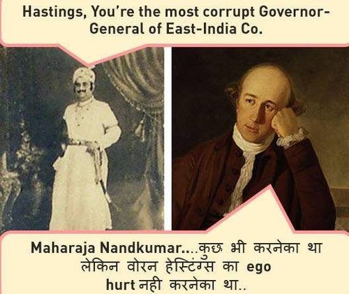 'व्यापारी म्हणून आले आणि राज्यकर्ते बनले' अशी ब्रिटिशांची भारतात ओळख आहे.त्यांच्या राज्यकारभाराची सुरुवात एका अर्थाने बंगालमधील प्लासीच्या लढाईने झाली.बक्सरच्या लढाईने त्यांच्या सत्तेवर शिक्कामोर्तब झाला.त्यानंतर त्यांनी कलकत्ता येथे आपल्या भारतातील साम्राज्याची पायाभरणी केली. त्या काळात त्यांना एका जमीनदाराने मोठ्या प्रमाणावर विरोध केला.वॉरन हेस्टिंग्ज या तत्कालीन ब्रिटिश गव्हर्नरवर त्या जमीनदाराने भ्रष्टाचाराचे आरोप केले. पण त्याच्या या विरोधाचे भलतेच परिणाम त्याला भोगावे लागले. हे प्रकरण त्याला इतके महागात पडले की त्यातून पुढे त्याचा मृत्यू झाला. धूर्त ब्रिटिशांनी त्याला 'राजकीय वध' असे गोंडस नाव दिले तरी हा पद्धतशीरपणे घडवून आणलेला खूनच होता. त्या जमीनदाराचे नाव होते नंदकुमार!