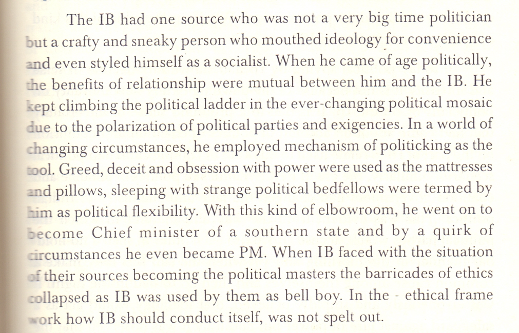 लेखक पुढे म्हणातात "When IB Faced with the situation of their sources becoming the political masters the barricades of ethics collapsed as IB was used by them as bell boy."