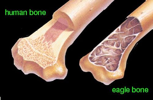 पोकळ हाडांमुळे पक्ष्यांचं वजन कमी राहतं आणि त्यांना उडण्यास मदत होते हे काही प्रमाणात खरं असलं तरी पूर्ण सत्य नाही. पक्ष्यांना मोठ्याप्रमाणात ऑक्सिजन लागतं म्हणून त्यांची हाडे पोकळ असतात. पक्ष्यांच्या हाडांच्या आतलं हे चित्र पाहा.